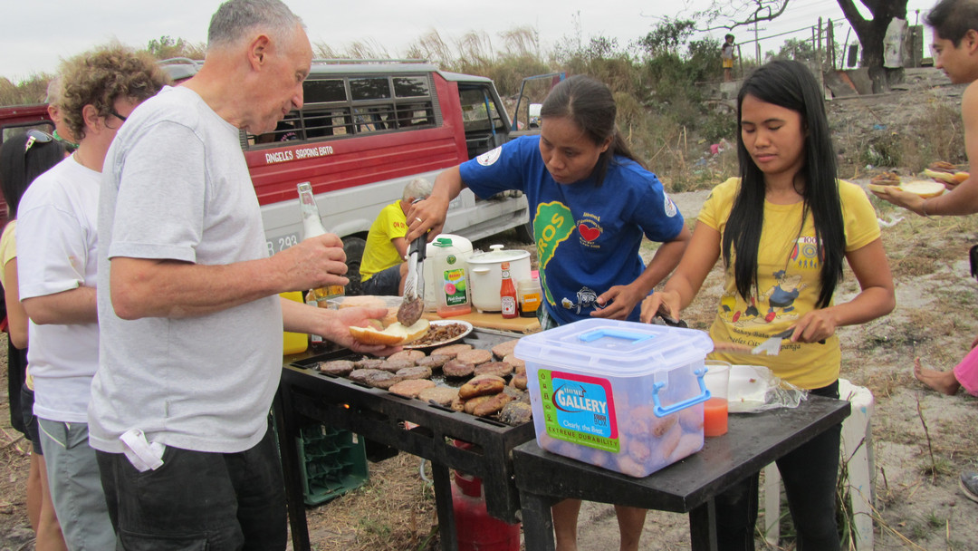 BBQ of Hamburgers with salad, Hot Dogs & Fish Heads.