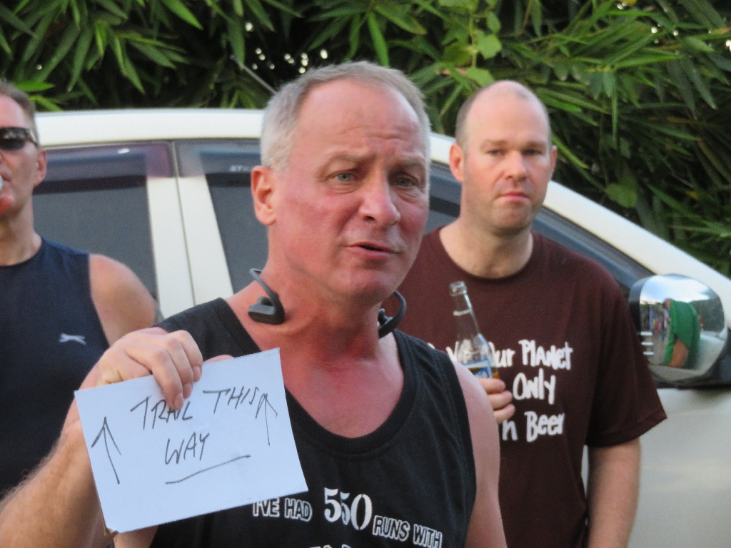 -Floopy Dick charging the Hares for leaving loose signs for the run
